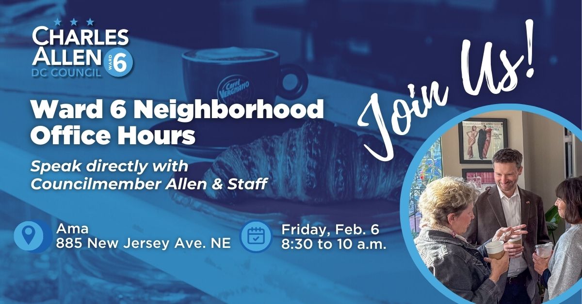 Join us for Neighborhood Office Hours in Navy Yard! Councilmember Charles Allen and our team will be at Ama (885 New Jersey Ave. SE) on the morning of Friday, Feb. 6, and we’d love to chat about anything on your mind — or just say hi!