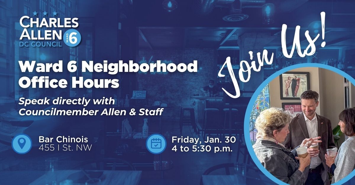 Join us for Neighborhood Office Hours in Mount Vernon Triangle! Councilmember Charles Allen and our team will be at Bar Chinois (455 I St. NW) on the afternoon of Friday, Jan. 30, and we’d love to chat about anything on your mind — or just say hi!