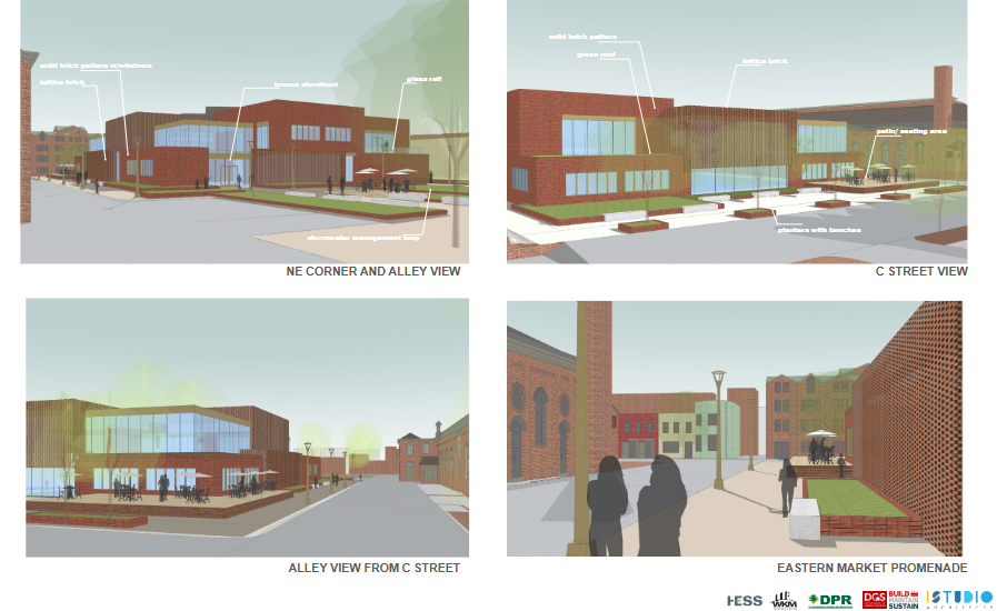 - Improved connections to the surrounding neighborhood, including preserving the North Carolina Avenue plaza used for weekend markets, transforming the alley into a well-lit, more pedestrian-friendly promenade oriented toward Eastern Market, and opening up the C Street side to feel more welcoming and connected rather than isolated behind a brick wall.